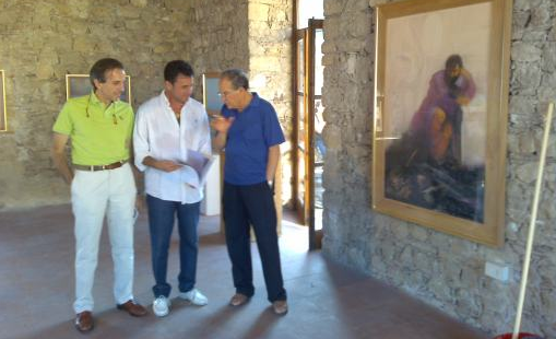 Durante l’allestimento della mostra, il corrispondente da Washington del Corriere della Sera, Paolo Valentino, il Presidente della Fondazione Mazzullo, Antonio Lo Turco ed il Maestro Piero Guccione discutono davanti all’opera “Fu la Scuola di Atene”