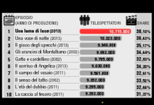 Il Commissario Montalbano quest’anno ha chiuso con il record assoluto, sia in termini di spettatori sia di share: Una lama di luce, quarto e ultimo dei nuovi episodi con Luca Zingaretti, ha raccolto ieri su Rai1 una media di 10.715.000 telespettatori pari al 38.13% di share, migliorando il precedente record del lunedì precedente (10.223.000 con il 36.43%).