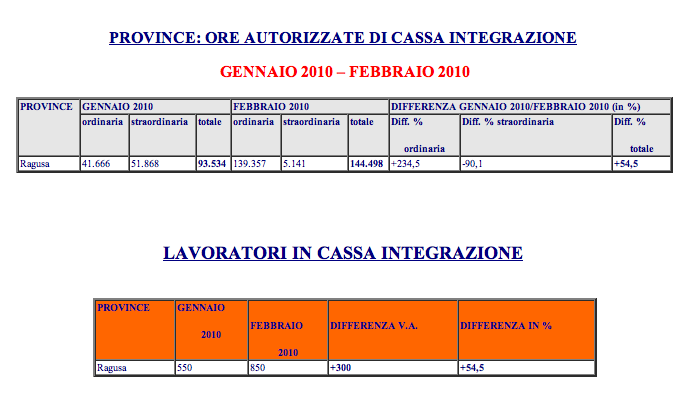 “In Provincia di Ragusa su circa 78.000 occupati dipendenti 1 lavoratore su 100 è stato collocato in cassa integrazione con punte di 94.000 ore autorizzate, tra CIGO e CIGS, che in termini statistici riproducono un 1.602% in più rispetto allo stesso mese del 2009.