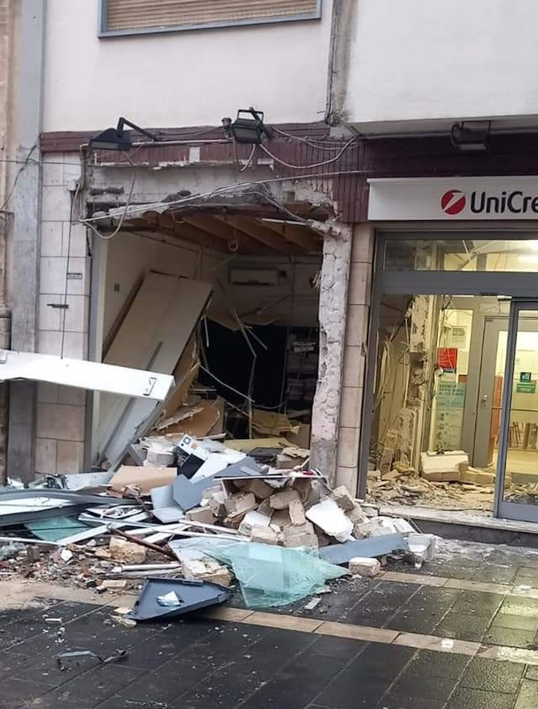 Quasi in contemporanea, a Buccheri, un altro gruppo è entrato in azione con modalità ancora più invasive. Utilizzando una pala meccanica, la banda ha sventrato la parete della filiale Unicredit, aprendo un varco per raggiungere le casse e prelevare il denaro custodito all’interno. Anche in questo caso l’azione si è svolta in pochi minuti, lasciando dietro di sé danni ingenti alla struttura.