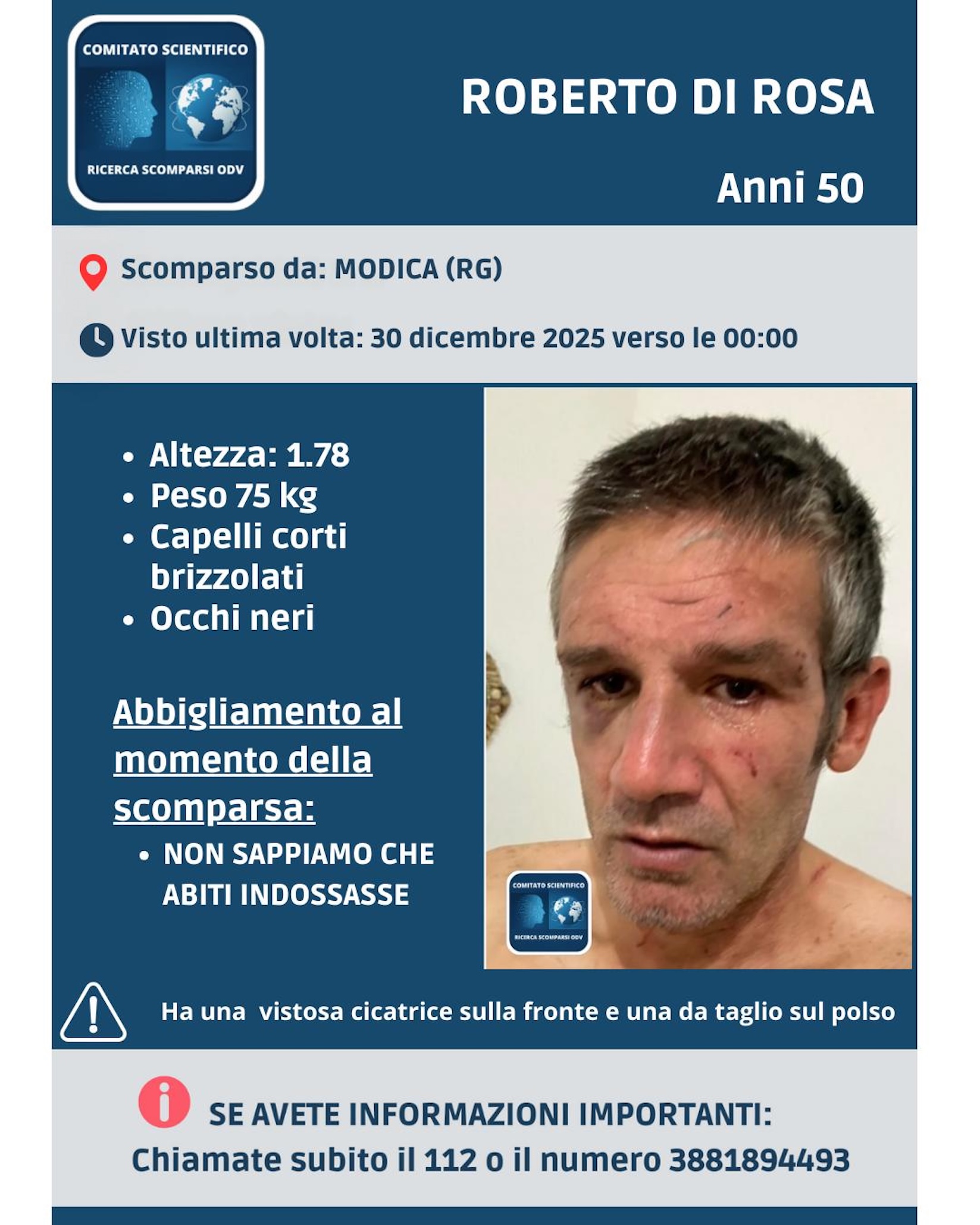 Modica – Roberto di Rosa si è allontanato dalla sua abitazione di Modica nella notte tra il 29 e il 30 dicembre. I familiari hanno sporto denuncia di scomparsaa ai carabinieri. L’uomo è alto un metro e 78 centimetri e ha una vistosa e riconoscibile cicatrice sulla fronte e una cicatrice da taglio su un polso.