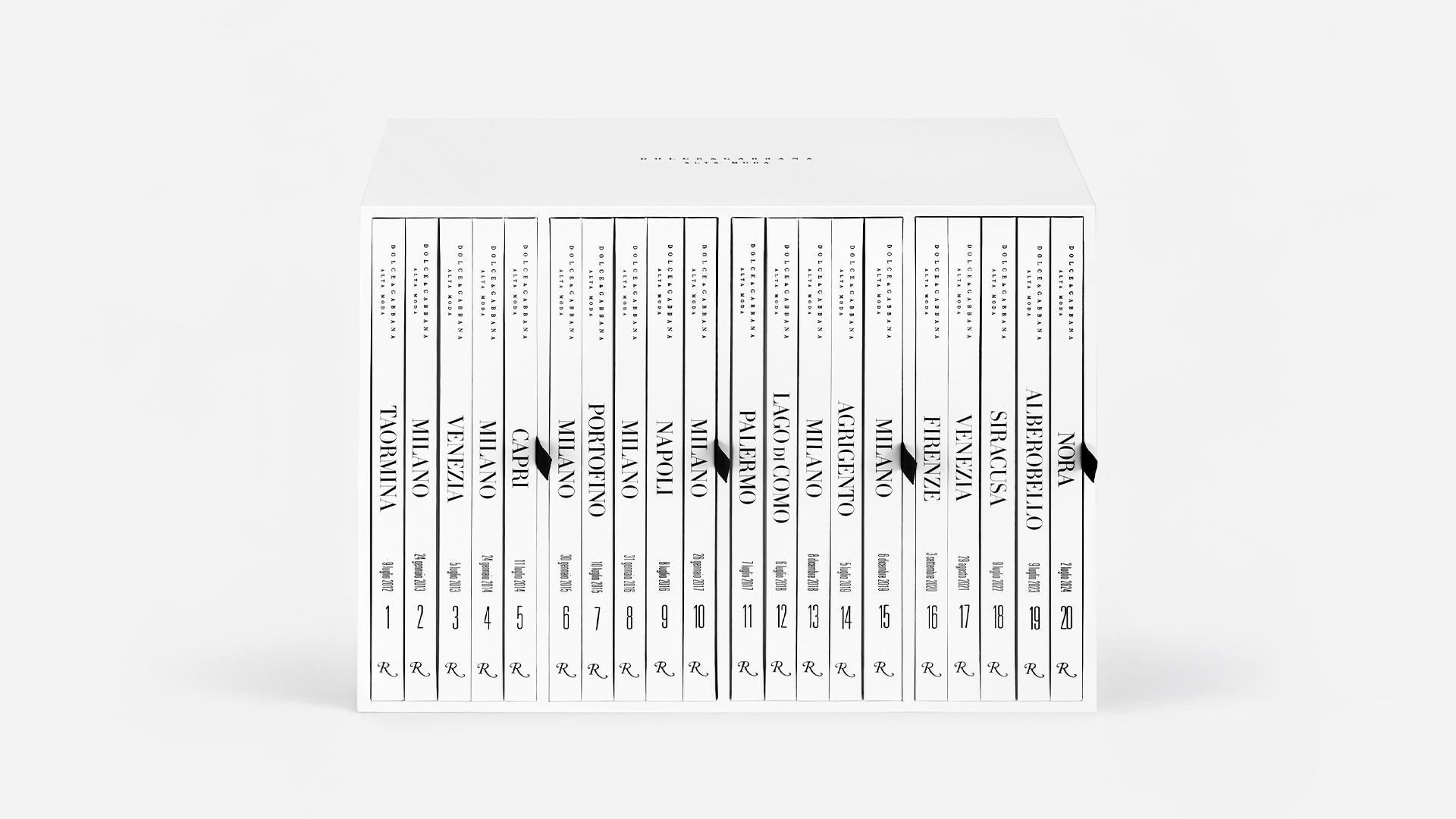 Tredici anni di eventi indimenticabili rivivono in una collezione editoriale unica: venti volumi in un cofanetto dal design raffinato, che racconta le sfilate di Dolce&Gabbana Alta Moda insieme alle atmosfere e al patrimonio culturale delle località italiane che le hanno ospitate.