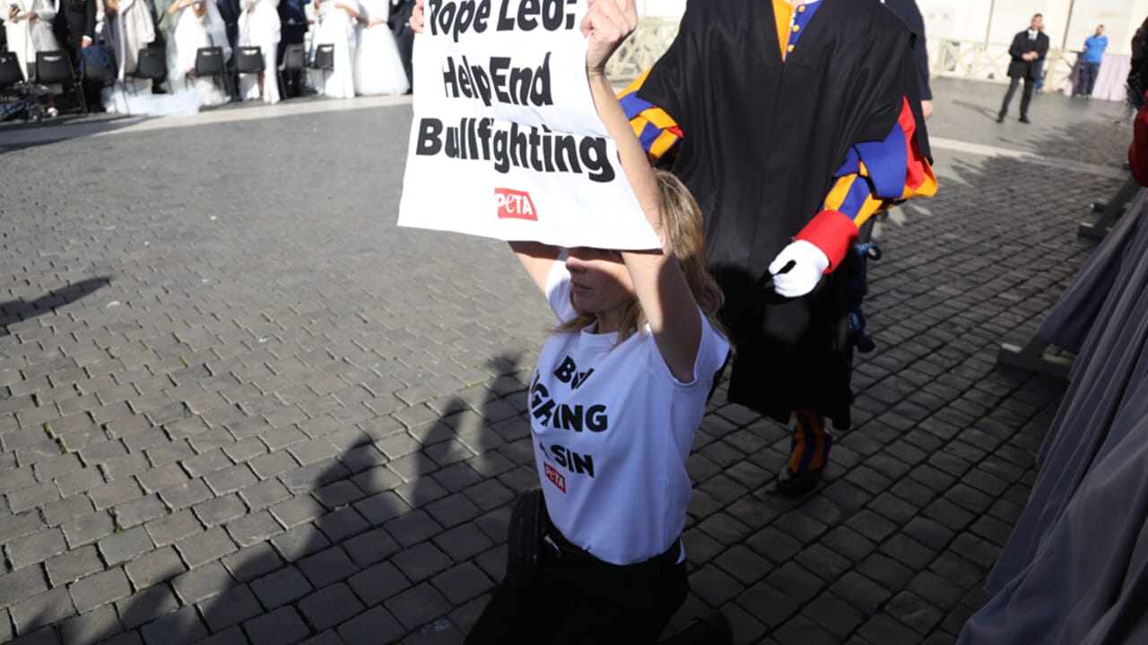 Attivista dell’organizzazione internazionale Peta, ha issato un cartello chiedendo a Papa Leone di prendere le distanze da una pratica crudele che in molti Paesi è spesso accompagnata dalla benedizione si sacerdoti cattolici