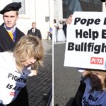 Attivista dell’organizzazione internazionale Peta, ha issato un cartello chiedendo a Papa Leone di prendere le distanze da una pratica crudele che in molti Paesi è spesso accompagnata dalla benedizione si sacerdoti cattolici