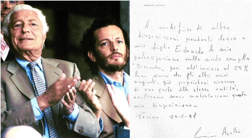 «A modifica di altre disposizioni precedenti lascio a mio figlio Edoardo la mia partecipazione nella società semplice ‘Dicembre’ pari all’incirca al 25%. Sono sicuro che gli altri miei congiunti, già proprietari ciascuno di una quota della stessa attività, accetteranno senza contestazioni questa mia disposizione». E’ il contenuto del nuovo testamento. Il documento è datato 20 gennaio 1998. La Dicembre è la “cassaforte” della famiglia Agnelli che controlla tutte le società del gruppo.