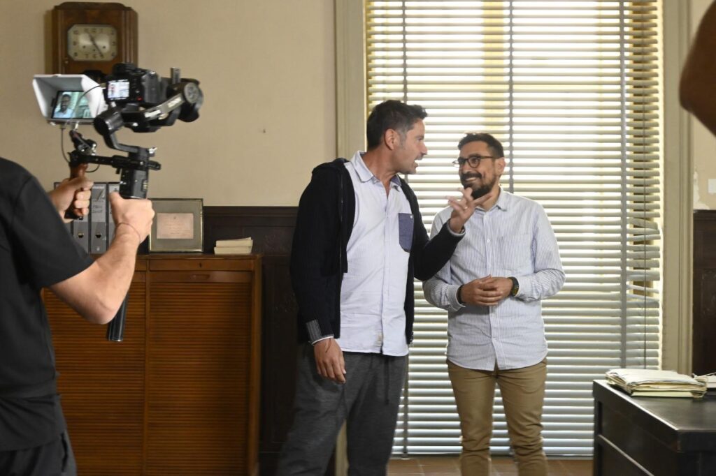 Nella foto di Tonino Trovato, Tinto intervista la guida Roberto Sammito all’interno del set del Commissariato di Montalbano.