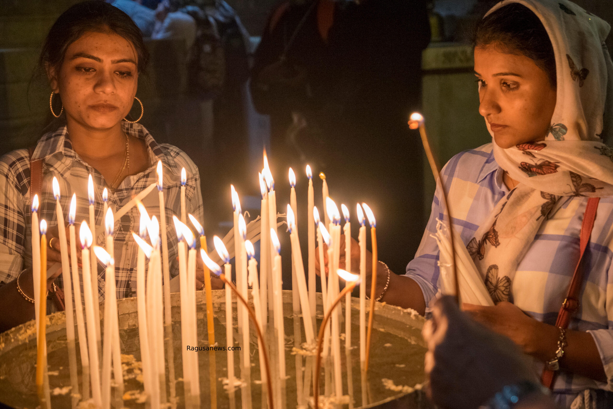 Nella foto, donne pregano nella chiesa del Santo Sepolcro a Gerusalemme.