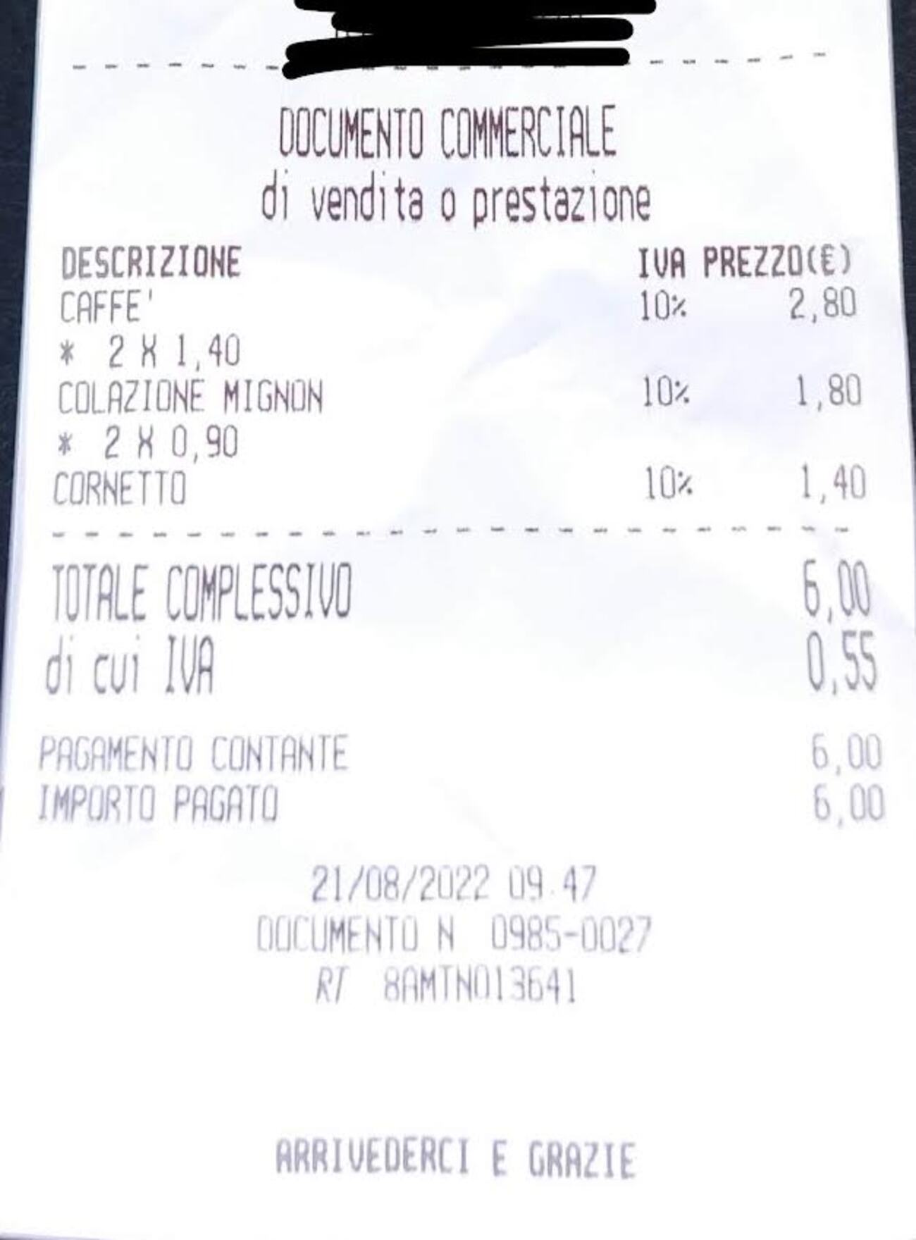 Eravamo in due e la consumazione riguardava 2 caffè, 2 cornetti medi, 1 genovese alla crema d’arancia, 4 bicchieri d’acqua al TAVOLO. Rileggendo ultima vostra pubblicazione, vorrei fare notare che il 20% non è riferito all’iva ma bensì al servizio al tavolo e erroneamente indicato da chi scrive. E’ vero che il servizio al tavolo non sempre è richiesto e con percentuali molto diverse, che può più o meno non piacere.