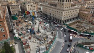 Al centro della piazza invece si predisporrà il cantiere, in vista del cambio di macrofase previsto in autunno, con l’avvio dello scavo archeologico e la realizzazione della prima porzione del solaio di copertura. Tali lavorazioni permetteranno il ribaltamento del cantiere garantendo la viabilità delle auto sul lato di Palazzo Venezia e la prosecuzione della realizzazione dei restanti diaframmi della scatola di stazione.