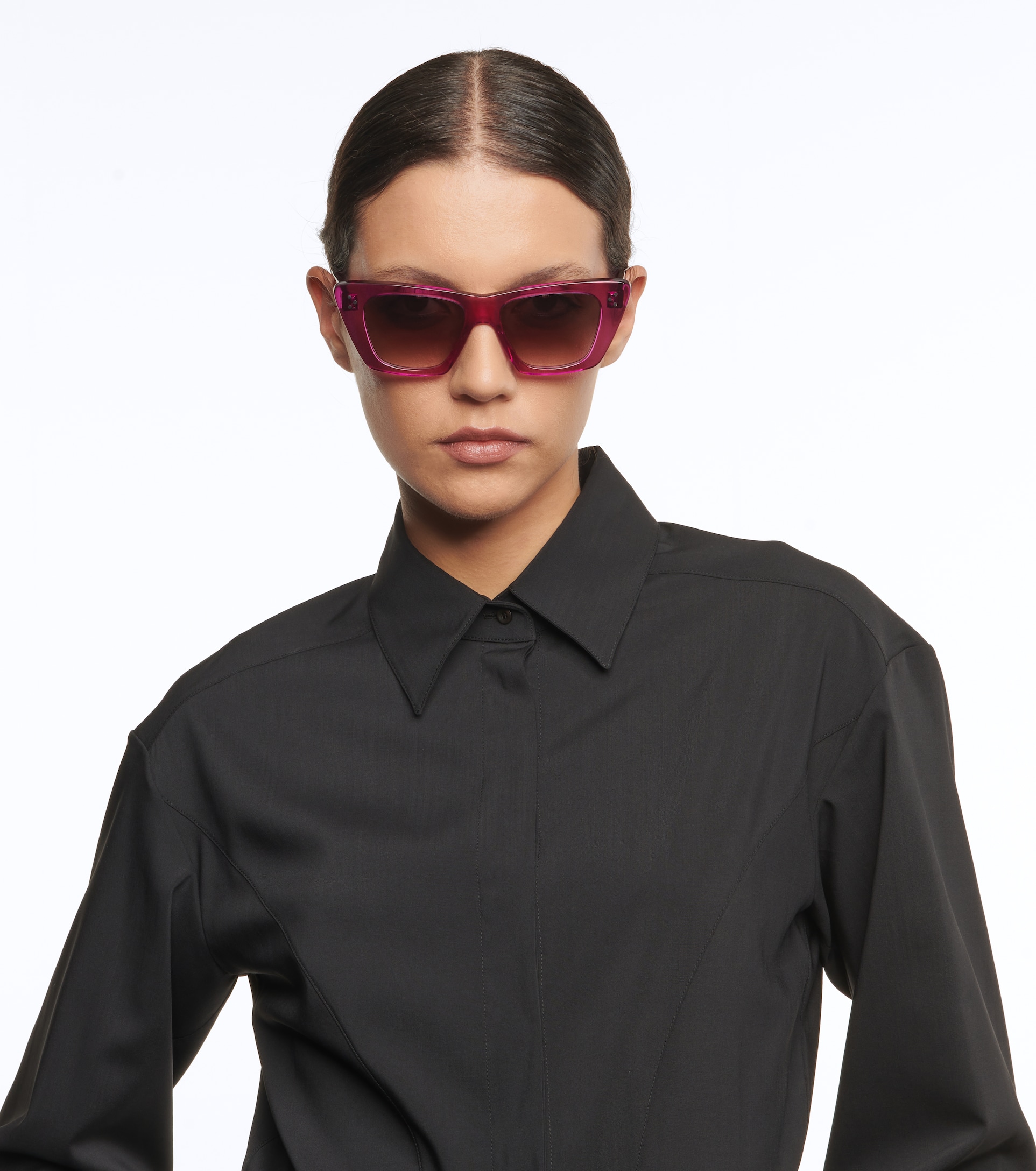 Di forma simile ma meno affusolati sono gli occhiali da sole di Celine Eyewear. Accattivanti come solo un occhiale cat-eye sa essere, si presentano di colore magenta con le lenti che sfumano sulle tonalità del grigio.