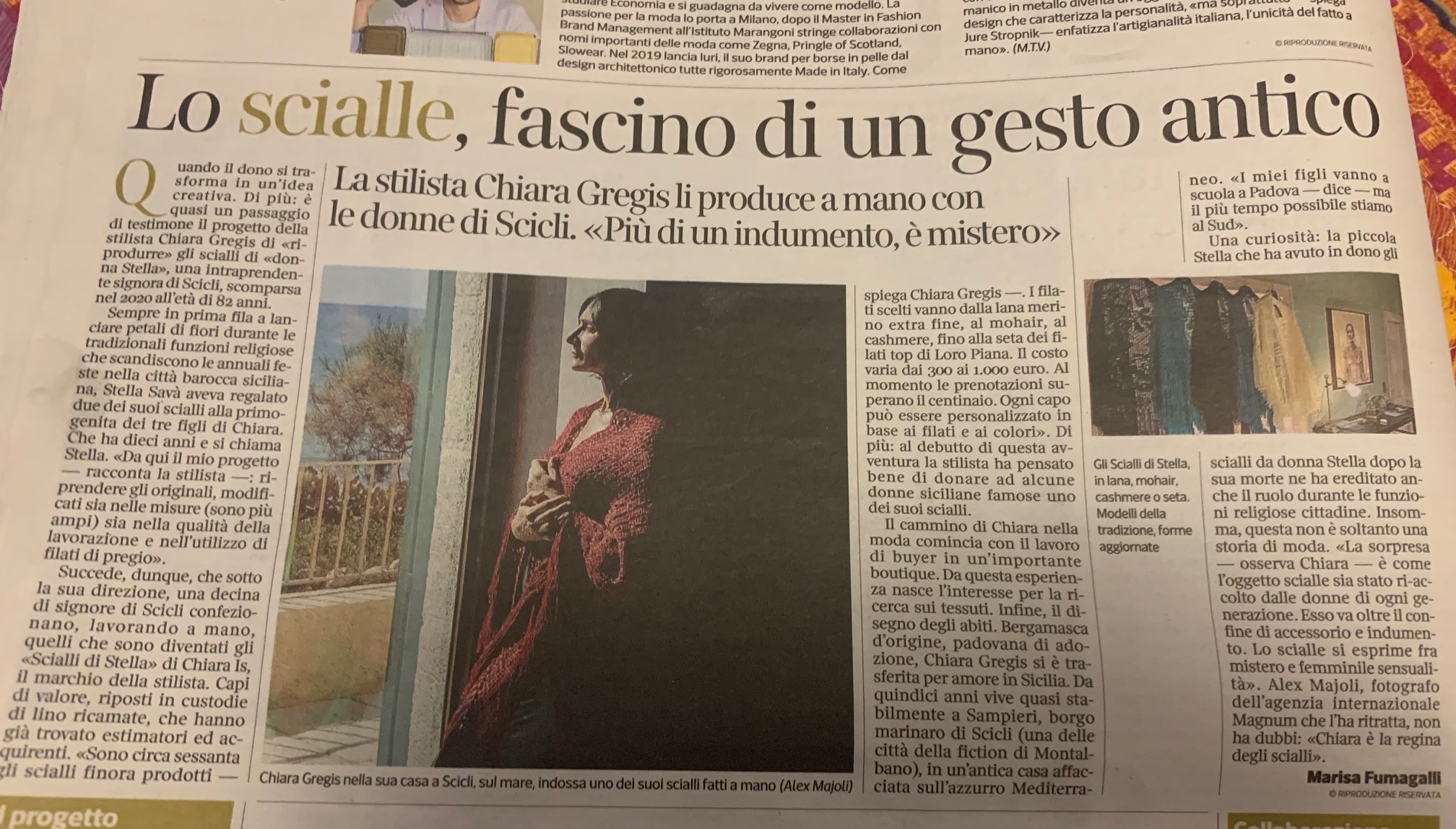 La zia Stella, come tutti la chiamavano a Scicli, le ha trasferito l’amore per gli scialli, e ora Chiara ne ha fatto un accessorio identitario. Ha chiesto ad alcune cucitrici e sarte di Scicli di mettersi al lavoro per realizzarne alcuni, personalizzati, che vende attraverso il proprio marchio, Chiara Is. La storia nell’inserto Liberi Tutti del Corriere della Sera in edicola stamani, a firma di Marisa Fumagalli.