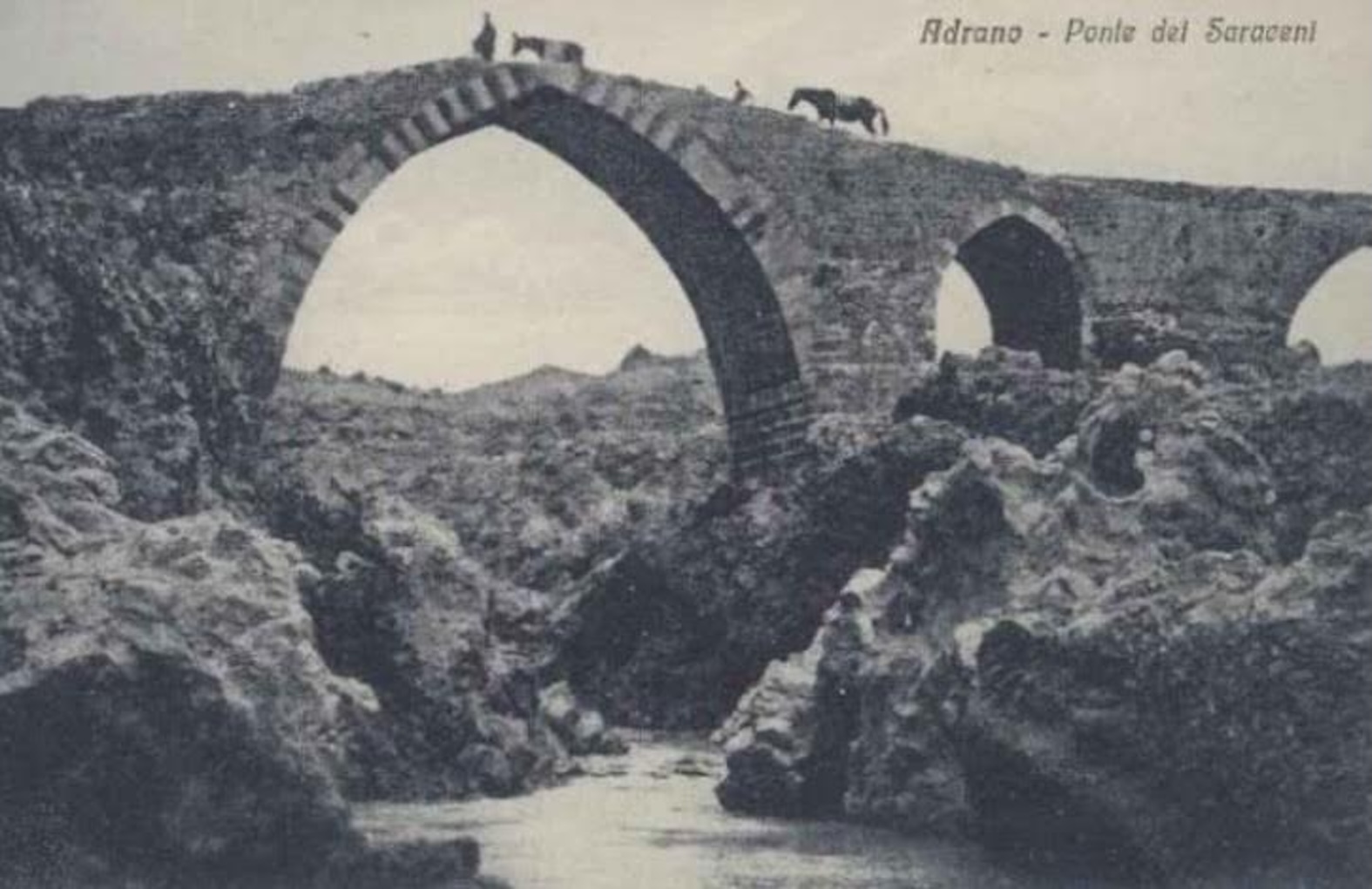 Come documenta lo studio di Sicilia Antica, la presenza di Paolo Orsi nell’antica “Adernò” – poi divenuta Adrano – risale al 1898, quando lo studioso arriva su invito di Salvatore Petronio Russo, sacerdote appassionato di storia ed archeologia che il 1° di aprile lo accompagna nei sopralluoghi dentro e fuori la cinta muraria di Adrano. Una “rapida passeggiata” di cinque ore circa, durante la quale Orsi annota puntualmente le sue impressioni sui monumenti visitati. Straordinaria la sua testimonianza sul paesaggio dell’Etna e del fiume Simeto che allora scorreva vorticoso sotto il Ponte dei Saraceni. Un’emozione che Orsi trasferisce puntualmente sul taccuino di viaggio, scrivendo: “Visito il ponte normanno sul Simeto detto Ponte dei Saraceni; panorama indimenticabile coi gorghi del fiume ed i monti verdi che ricordano, salvo il colore, le Alpi”.