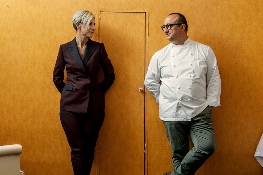 Sui tavoli del ristorant sarà posta la lampada Tetatet, scelta per mettere in scena il piatto. Una versione personalizzata creata dal laboratorio di Piacenza con disegno e materiali originali, per sposarsi perfettamente alla cucina dello chef di Ragusa, che ha al suo fianco la dolce Gabriella.