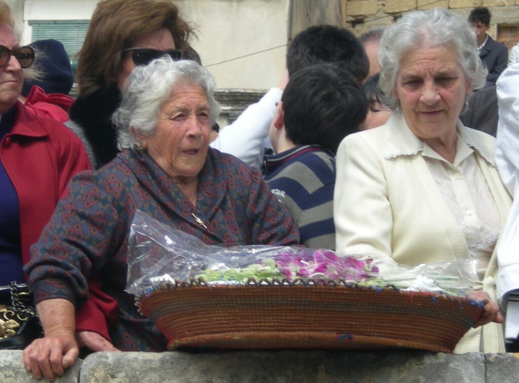 Nella foto, quella che a Scicli è conosciuta come la “zia Stella” (al secolo Stella Savà) in attesa di lanciare petali di fiori al Gioia