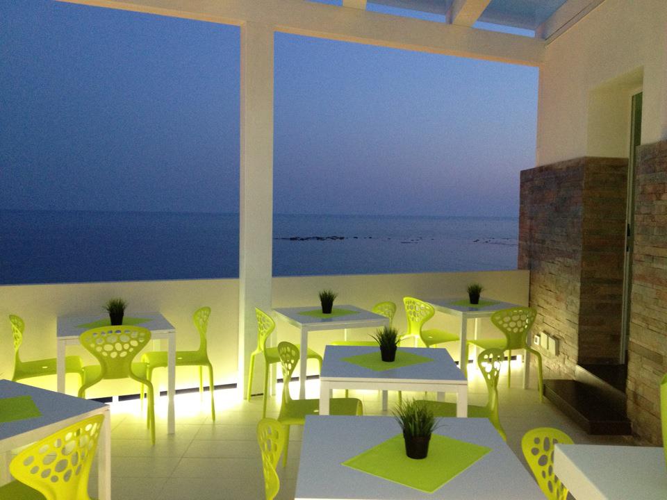 Il ristorante offre anche la possibilità di pranzare e cenare all’aperto durante la bella stagione, in un ambiente confortevole ed elegante in cui dominano i toni del bianco,la recente apertura del terrazzo poi da l’idea di stare sospesi tra cielo e mare godendo di un panorama che toglie letteralmente il fiato. L’ambientazione primaverile ed estiva è ideale per romantiche cene a lume di candela.