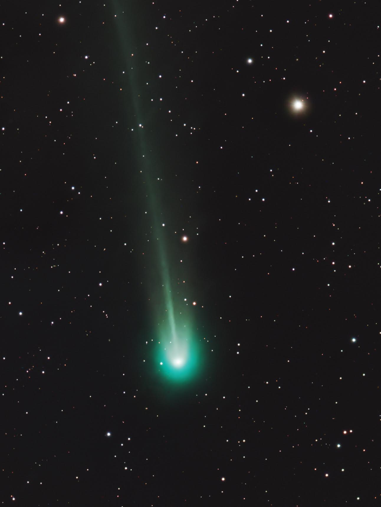 La chioma appare compatta e il colore verdastro, tipico della fluorescenza delle molecole di C₂ sotto l’azione della radiazione solare, comincia a distinguersi nelle immagini a lunga esposizione. Non mancano accenni di una coda in formazione, sebbene ancora poco evidente e soggetta alle variazioni dell’attività cometaria”.