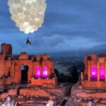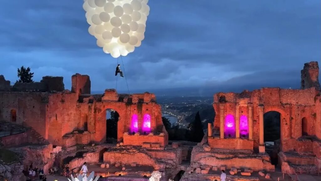Taormina – A Taormina tutto è possibile. Durante un matrimonio da sogno al Teatro Antico, lo sposo ha fatto il suo ingresso volando sopra le rovine greche appeso a decine di palloncini bianchi. Una scena incredibile, ripresa dagli ospiti e condivisa sui social, che ha lasciato tutti senza parole. L’evento, ripreso anche da alcuni turisti presenti, si è trasformato in un vero e proprio spettacolo a cielo aperto, con il celebre teatro illuminato e un’atmosfera degna di un film romantico. Tra applausi, musica e luci soffuse, l’arrivo dello sposo dall’alto ha unito la magia del luogo con l’estro delle celebrazioni siciliane. Un momento unico, sospeso tra la storia millenaria di Taormina e la voglia di stupire di un matrimonio che difficilmente verrà dimenticato.