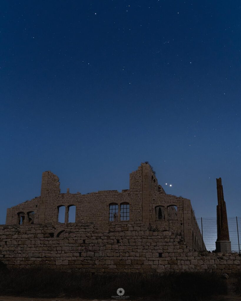 Scicli – Sotto un cielo limpido pieno di stelle, la Fornace di Sampieri si staglia contro la luce dei pianeti Venere e Giove, protagonisti di una spettacolare congiunzione, un incontro ravvicinato ovviamente solo prospettico. Le rovine in pietra raccontano storie di un passato industriale, fondendo storia e astronomia in un’unica suggestiva scena.