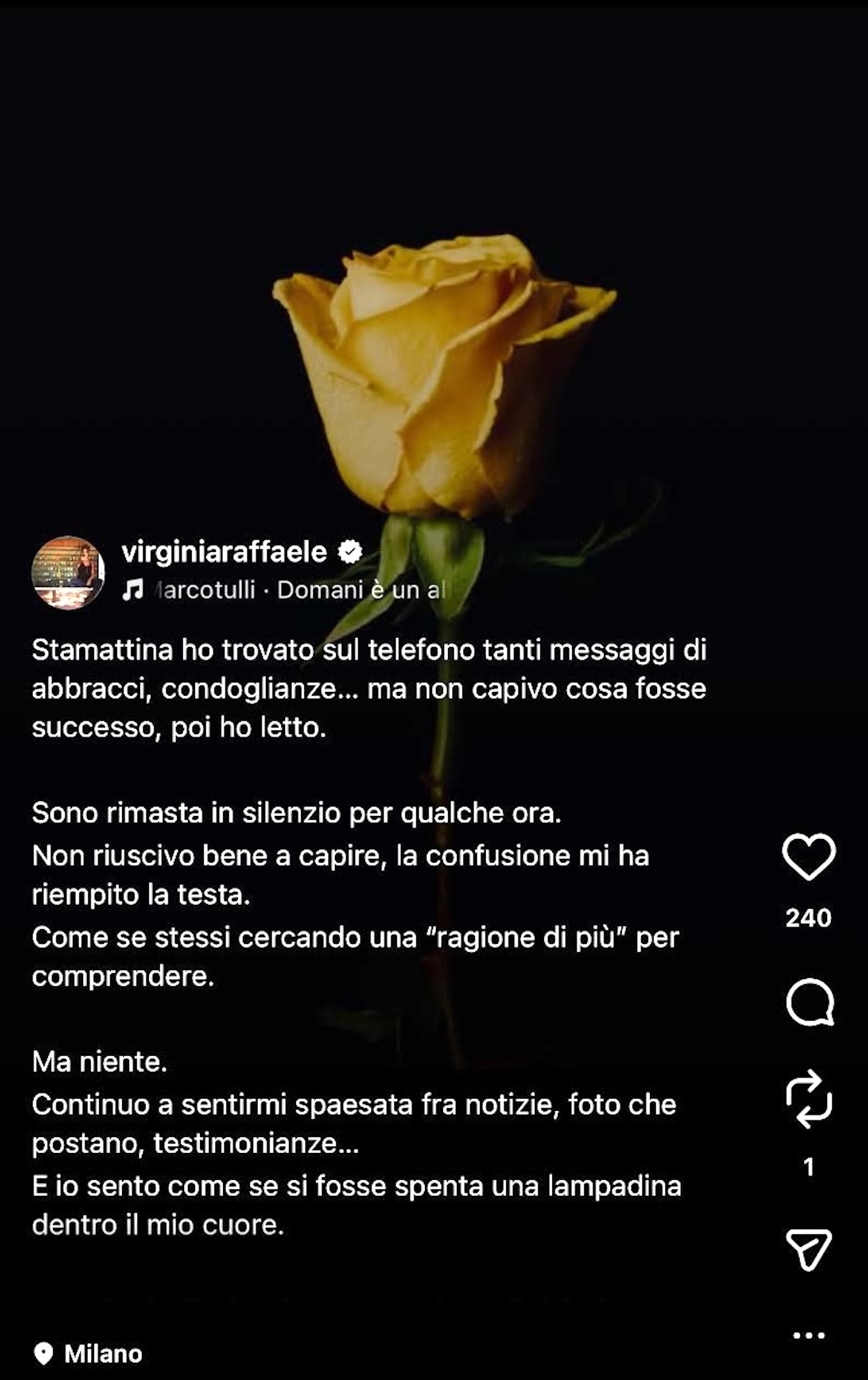 “Stamattina ho trovato sul telefono tanti messaggi di abbracci, condoglianze…ma non capivo cosa fosse successo. Poi ho letto. Somno rimasta in silenzio per qualche ora. Non riuscivo bene a capire, la confusione mi ha riempito la testa. Come se stessi cercando “una ragione in più” per comprendere.